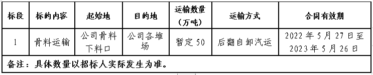 (二)2022年5月18日9:00至2022年5月21日9:00在禮泉海螺物資陽光采購平臺發(fā)布骨料運輸招標(biāo)公告,同步在禮泉海螺公司大門、開票大廳、直供電廠及礦點等發(fā)布招標(biāo)公告,同時在當(dāng)?shù)刂饕獔笊邕M行公告,并接受報名;