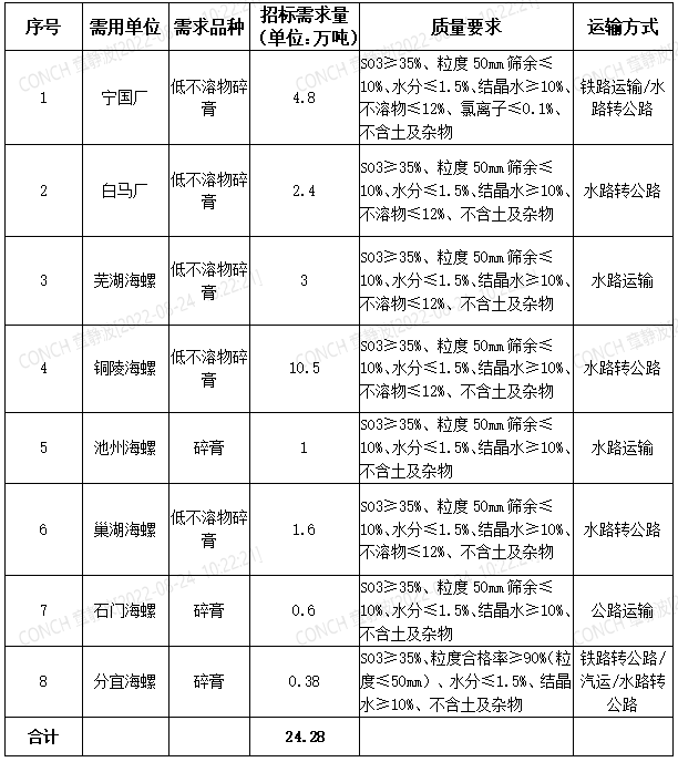 根據(jù)公司生產(chǎn)經(jīng)營計劃,安徽海螺水泥股份有限公司對華東及中部地區(qū)2022年10月-2023年3月天然石膏進行招標,為進一步體現(xiàn)公平、公正、公開的原則,拓寬采購渠道,提高采購質(zhì)量,現(xiàn)將招標采購信息發(fā)布如下: