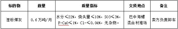 根據(jù)巴中海螺生產(chǎn)經(jīng)營需求,現(xiàn)對水泥生產(chǎn)用濕粉煤灰采購業(yè)務(wù)進行公開招標,為體現(xiàn)公平、公正、公開、透明的原則,現(xiàn)將招標相關(guān)事宜公告如下: