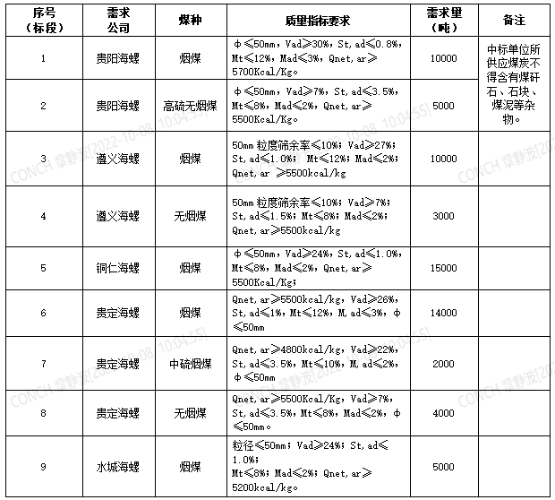 海螺水泥貴州區(qū)域擬對2022年10月21日至2022年11月20日生產(chǎn)用煤炭進行公開招標,選定中標單位,現(xiàn)將相關(guān)招標事宜公示如下: