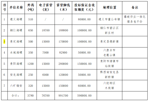 貴州區(qū)域7家子公司外委爆破服務合同于2022年12月31日到期,為確保各公司外委爆破服務的連續(xù)性,按照“一區(qū)一策”采購權(quán)限劃分要求,供應專業(yè)組擬開展2023年度區(qū)域外委爆破、安全監(jiān)理及評估服務聯(lián)合招標工作。現(xiàn)將相關事宜公示如下: