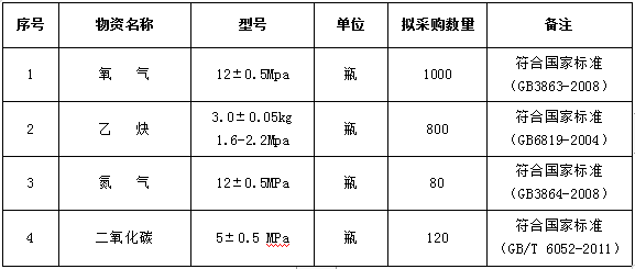 1.招標物資名稱:工業(yè)氣體(氧氣、乙炔、氮氣、二氧化碳)。