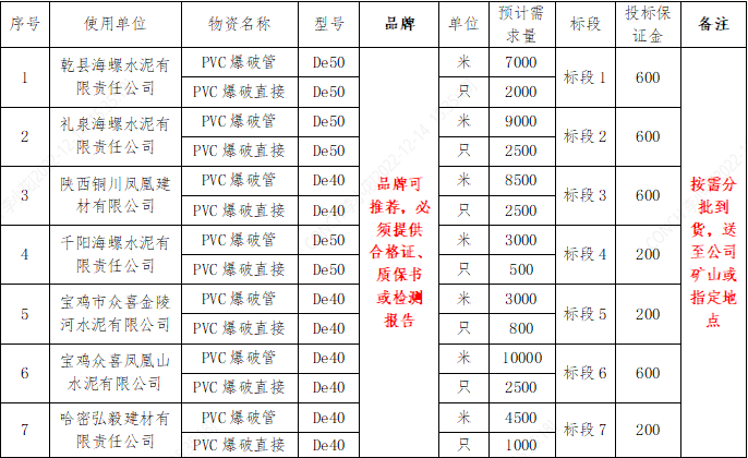 為進(jìn)一步優(yōu)化拓展供應(yīng)渠道,降低采購(gòu)成本,規(guī)范采購(gòu)行為,充分發(fā)揮區(qū)域集中采購(gòu)優(yōu)勢(shì),提高采購(gòu)效率,本著公開、公平、公正、透明的原則,擬對(duì)陜甘區(qū)域2023年度PVC爆破管、PVC爆破直接進(jìn)行聯(lián)合公開招標(biāo)采購(gòu),擇優(yōu)選擇供應(yīng)商,現(xiàn)將招標(biāo)基本信息發(fā)布如下:
