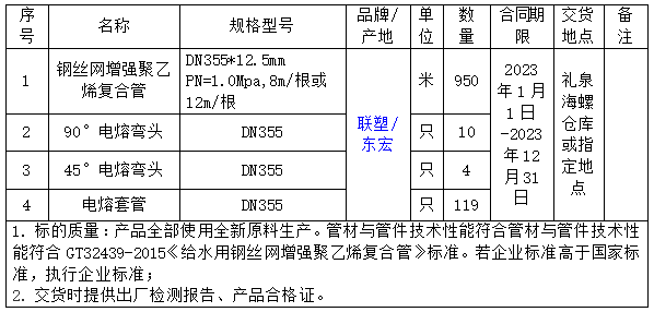 為進一步優(yōu)化拓展供應(yīng)渠道,降低采購成本,規(guī)范采購行為,提高采購效率,本著公開、公平、公正、透明的原則,擬開展鋼絲網(wǎng)增強聚乙烯復(fù)合管及配件招標采購工作,擇優(yōu)選擇供應(yīng)商,現(xiàn)將招標基本信息發(fā)布如下: