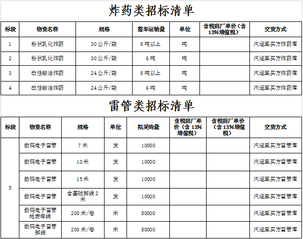 1.招標(biāo)物資名稱:火工材料(改性銨油炸藥、粉狀乳化炸藥、工業(yè)雷管及導(dǎo)爆管)。