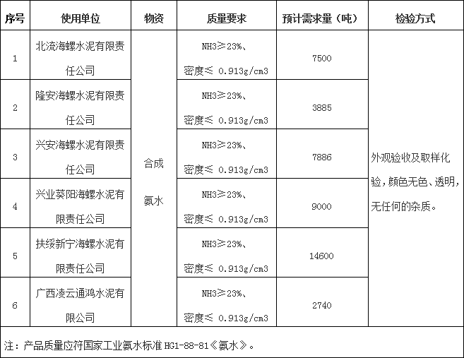 根據(jù)海螺水泥廣西區(qū)域6家水泥企業(yè)生產(chǎn)經(jīng)營(yíng)計(jì)劃,擬對(duì)區(qū)域6家公司2023-2024年度生產(chǎn)用工業(yè)氨水進(jìn)行公開(kāi)聯(lián)合招標(biāo),本著“公開(kāi)、公平、公正”的競(jìng)爭(zhēng)原則,拓寬采購(gòu)渠道,保證采購(gòu)質(zhì)量,現(xiàn)面向社會(huì)對(duì)本次招標(biāo)進(jìn)行公示,歡迎具備條件的單位參加本次招標(biāo),現(xiàn)將有關(guān)事項(xiàng)公示如下: