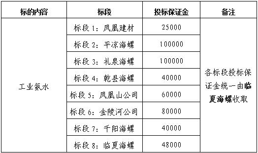 本次氨水招標(biāo)分臨夏海螺、禮泉海螺、乾縣海螺、鳳凰山公司、金陵河公司、千陽海螺、平?jīng)龊B?、鳳凰建材8個(gè)標(biāo)段,若投標(biāo)人只投一個(gè)標(biāo)段(臨夏海螺標(biāo)段、禮泉海螺標(biāo)段、乾縣海螺標(biāo)段、鳳凰山公司標(biāo)段、金陵河公司標(biāo)段、千陽海螺標(biāo)段、平?jīng)龊B輼?biāo)段、鳳凰建材標(biāo)段),則只需繳納對應(yīng)標(biāo)段的投標(biāo)保證金,若投標(biāo)2個(gè)及以上標(biāo)段則按照對應(yīng)標(biāo)段投標(biāo)保證金累加計(jì)算并繳納,匯款需注明具體投標(biāo)的標(biāo)段。