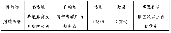 2.標(biāo)段運(yùn)輸起止:華能嘉祥發(fā)電有限公司-濟(jì)寧海螺廠內(nèi)脫硫石膏卸車點(diǎn)。