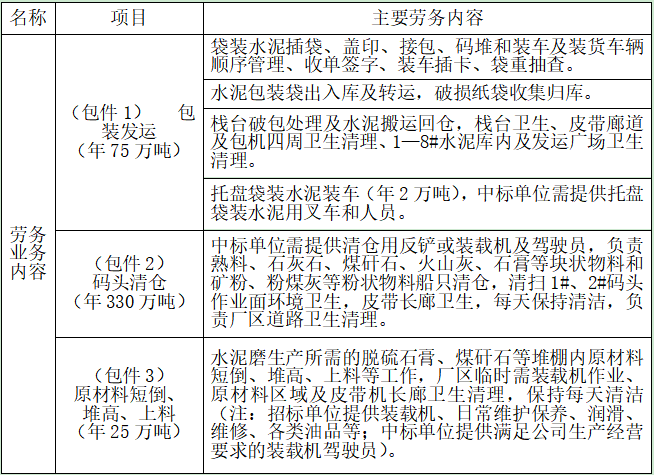 以上包件勞務(wù)合同期限為1年(自勞務(wù)合同簽訂之日起計算),招標人年水泥包裝量約75萬噸,年碼頭清倉量約330萬噸、年原材料短倒上料量約25萬噸,具體以實際發(fā)生數(shù)量為準。