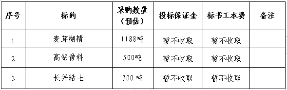 根據(jù)高鋁磚及堿性磚分廠2023年10-12月份產(chǎn)品生產(chǎn)計劃,結(jié)合前期麥芽糊精、高鋁骨料、粘土等3類原材料合同執(zhí)行及庫存消耗情況,為保證生產(chǎn)所需原材料有序銜接,同時進(jìn)一步降低采購成本,現(xiàn)本著“公開、公平、公正、透明”的原則公開招標(biāo),誠邀經(jīng)營資質(zhì)能力較好、保供和服務(wù)能力較強(qiáng)的單位參加投標(biāo)?,F(xiàn)就招標(biāo)相關(guān)事項公示如下: