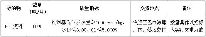 根據(jù)巴中海螺生產(chǎn)經(jīng)營需求,現(xiàn)對RDF燃料采購業(yè)務(wù)進行公開招標(biāo),本著公平、公正、公開、透明的原則,現(xiàn)將招標(biāo)相關(guān)事宜公示如下: