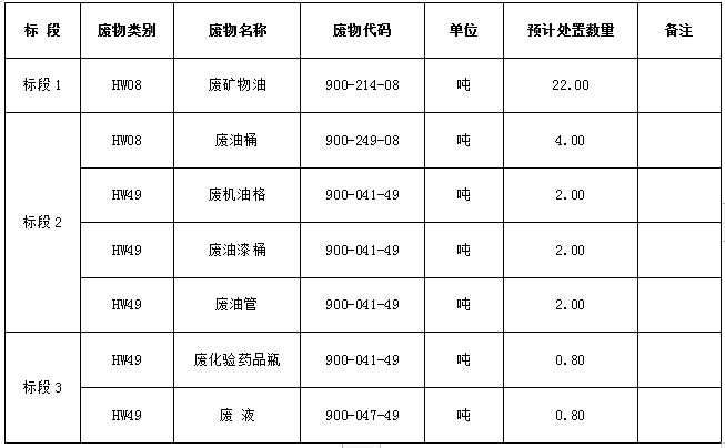 1.處置標的內(nèi)容:廢礦物油、廢油桶、廢機油格、廢油漆桶、廢油管、廢化驗藥品瓶、廢液。
