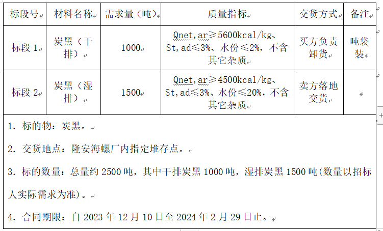 根據(jù)隆安海螺水泥有限責(zé)任公司生產(chǎn)需求,擬對生產(chǎn)用炭黑進行招標(biāo)采購,為體現(xiàn)公平、公正、公開的原則,通過網(wǎng)上海螺陽光智慧采購平臺(網(wǎng)址:http://srm.chinaconch.com/)進行公開招標(biāo),現(xiàn)將招標(biāo)相關(guān)事宜公告如下: