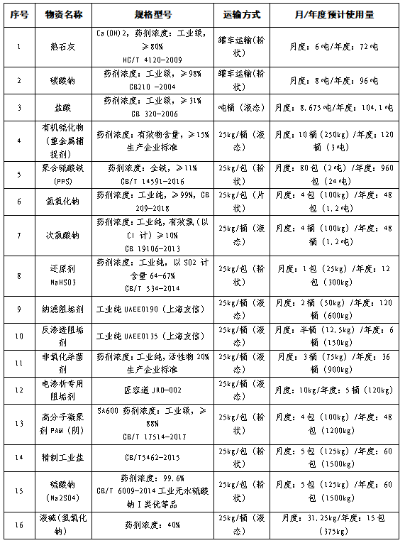 3.標(biāo)的內(nèi)容:熟石灰、碳酸鈉、鹽酸、有機硫化物(重金屬捕捉劑)、聚合硫酸鐵(PFS)、氫氧化鈉、次氯酸鈉、還原劑NaHSO3、納濾阻垢劑、反滲透阻垢劑、非氧化殺菌劑、電滲析專用阻垢劑、PAM(陰)、精制工業(yè)鹽、硫酸鈉(Na2SO4)(Ⅰ類優(yōu)等品)、液堿(氫氧化鈉)等16種藥品。