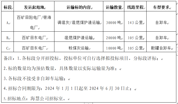 3.本次招標(biāo)活動(dòng)要求投標(biāo)單位具有較好的運(yùn)輸保供能力,運(yùn)輸業(yè)務(wù)要求自卸車運(yùn)輸,各標(biāo)段擬投入車輛分別為:A標(biāo)段不少于8輛,B標(biāo)段不少于5輛,C標(biāo)段不少于3輛,掛靠車輛需提供有效期涵蓋運(yùn)輸招標(biāo)合同期限的掛靠協(xié)議或證明,且不可同一車輛同時(shí)掛靠2家及以上運(yùn)輸單位,若重復(fù)則同時(shí)核減運(yùn)力(運(yùn)力不足的單位無法通過資質(zhì)評(píng)審)。能24小時(shí)滿足招標(biāo)單位運(yùn)輸要求,不能影響招標(biāo)單位正常的生產(chǎn)經(jīng)營活動(dòng),投標(biāo)方在以往運(yùn)輸過程中無不良記錄,不接受海螺集團(tuán)內(nèi)部黑名單企業(yè)投標(biāo)。投標(biāo)多標(biāo)段的運(yùn)力需疊加計(jì)算。