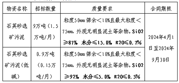 投標人在報價時應綜合考慮石英砂選礦污泥生產(chǎn)、運輸過程中一切不確定因素,以及我公司要求的硅含量、堿含量等質(zhì)量指標,合理報價。合同期內(nèi)價格固定不變。兩種質(zhì)量石英砂選礦污泥分標段分別評標,按各標段最低價原則選擇中標單位。