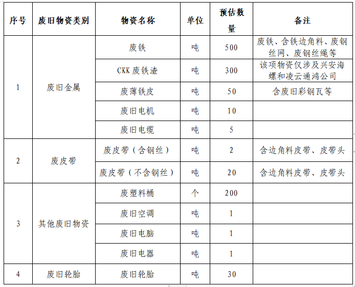 1.包含但不限于以上廢舊物資類(lèi)別,同時(shí)數(shù)量?jī)H為預(yù)估數(shù)量,具體數(shù)量以實(shí)際過(guò)磅或點(diǎn)數(shù)回收數(shù)量為準(zhǔn)。