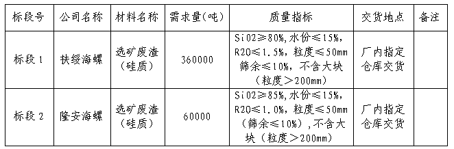 隆安海螺水泥有限責(zé)任公司擬開展扶綏海螺、隆安海螺2024年下半年選礦廢渣采購聯(lián)合招標(biāo)工作,本著“公開、公平、公正”原則,隆安海螺公司通過海螺陽光智慧采購平臺(tái)(網(wǎng)址:http://srm.chinaconch.com/)進(jìn)行公開招標(biāo),現(xiàn)將招標(biāo)相關(guān)事宜公告如下: