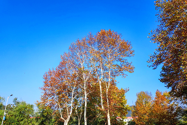 湛藍(lán)天空下,樹木枝葉浸染斑斕秋色,于工業(yè)景致中勾勒出一抹自然暈染的生機(jī)畫卷。