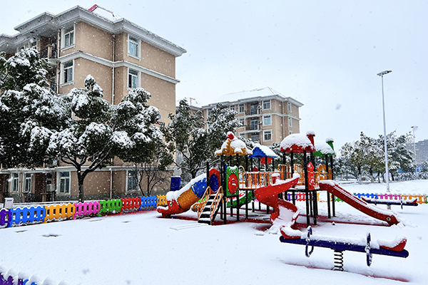 皚皚白雪包裹著童趣盎然的游樂場,與遠(yuǎn)處淺褐色的宿舍樓剪影相映成趣。
