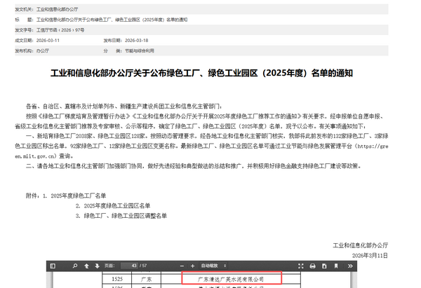 近日,工業(yè)和信息化部網(wǎng)站正式公布2025年綠色工廠、綠色工業(yè)園區(qū)名單,廣英水泥憑借在綠色制造、節(jié)能降耗、環(huán)境友好等方面的卓越表現(xiàn),成功獲評國家級“綠色工廠”。這不僅是對公司長期以來堅持綠色轉(zhuǎn)型踐行可持續(xù)發(fā)展理念的高度認(rèn)可,更標(biāo)志著公司正式躋身國家綠色制造“第一梯隊”以硬核實力交出了一份高質(zhì)量轉(zhuǎn)型的優(yōu)異答卷。
